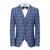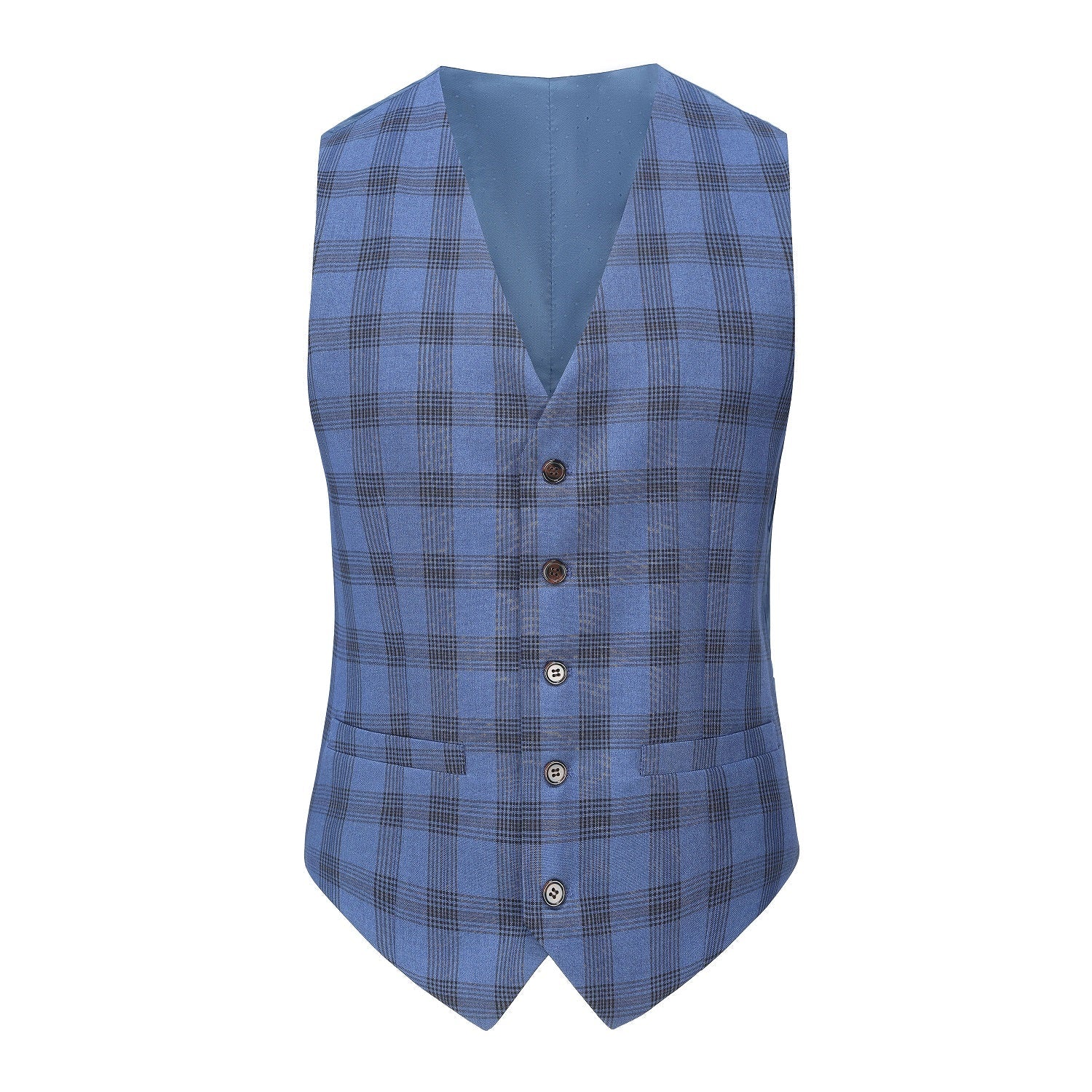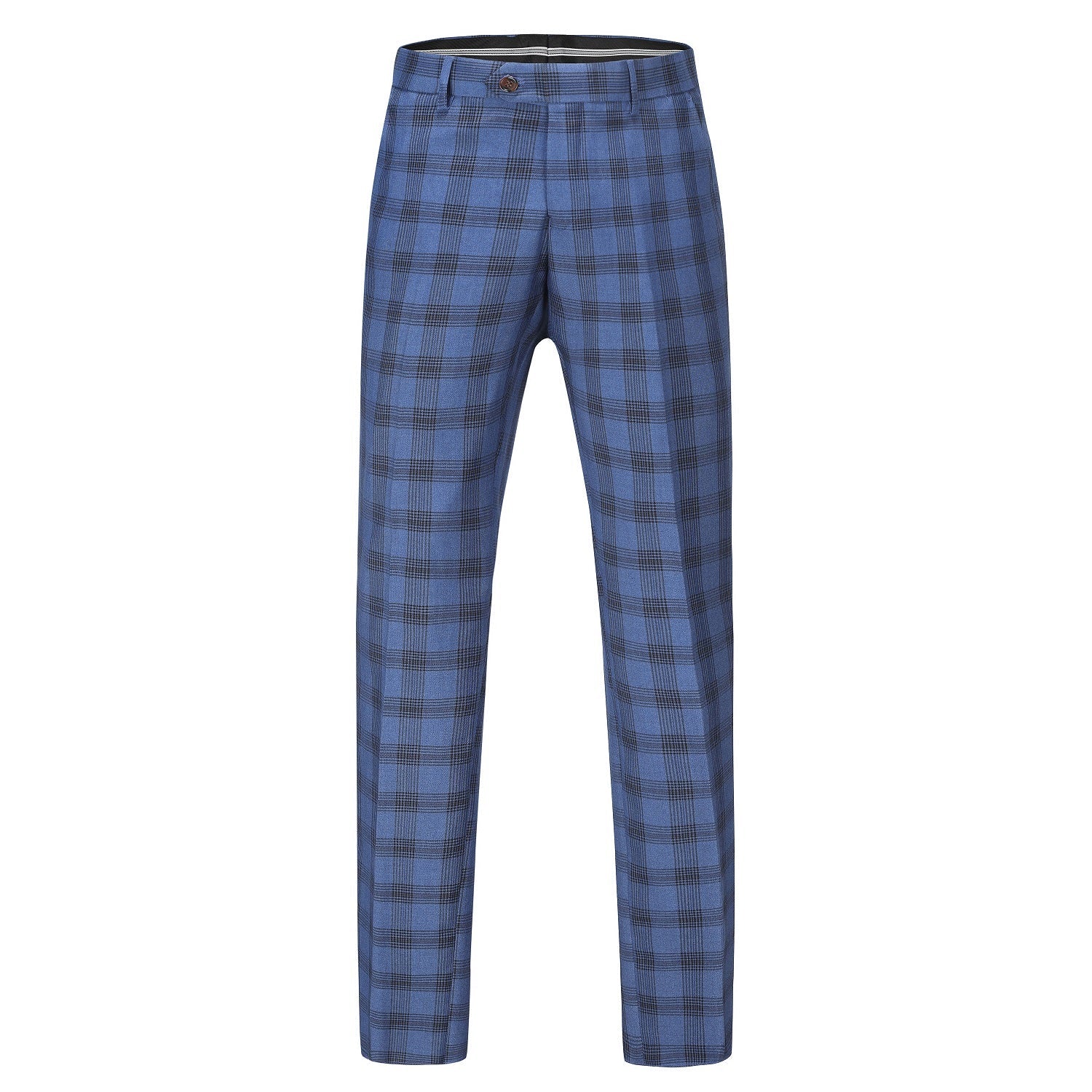 Elevate your wardrobe with the Men's 3-Piece Performance Stretch Slim Fit Blue & Black Plaid Suit. Inspired by European tailoring, its slim fit exudes refinement, making it a top choice for individuals with a slender stature or those on the taller spectrum. The jacket, beautifully adorned in blue and black plaid, showcases a polished two-button single-breasted closure. Its chest pocket is primed for a signature pocket square or handkerchief, and the inclusion of two external flap pockets and three internal ones ensures a blend of style and utility. The trousers, with their flat-front design, arrive unhemmed, allowing for a precise and personalized fit. Whether attending a board meeting, a wedding, or a sophisticated soirée, this suit stands as a testament to impeccable style and craftsmanship.