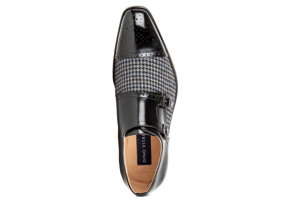 These elegant men's dress shoes by Gino Vitale feature the best of both worlds: a double monk strap and fine perforated medallion detail on the cap toe. The upper features a mixed media look with a combination of houndstooth fabric and vegan faux leather. Pair these with your favorite suit and stand out at any event. This shoe is ideal for the man who wants to put a modern twist on a classic style.